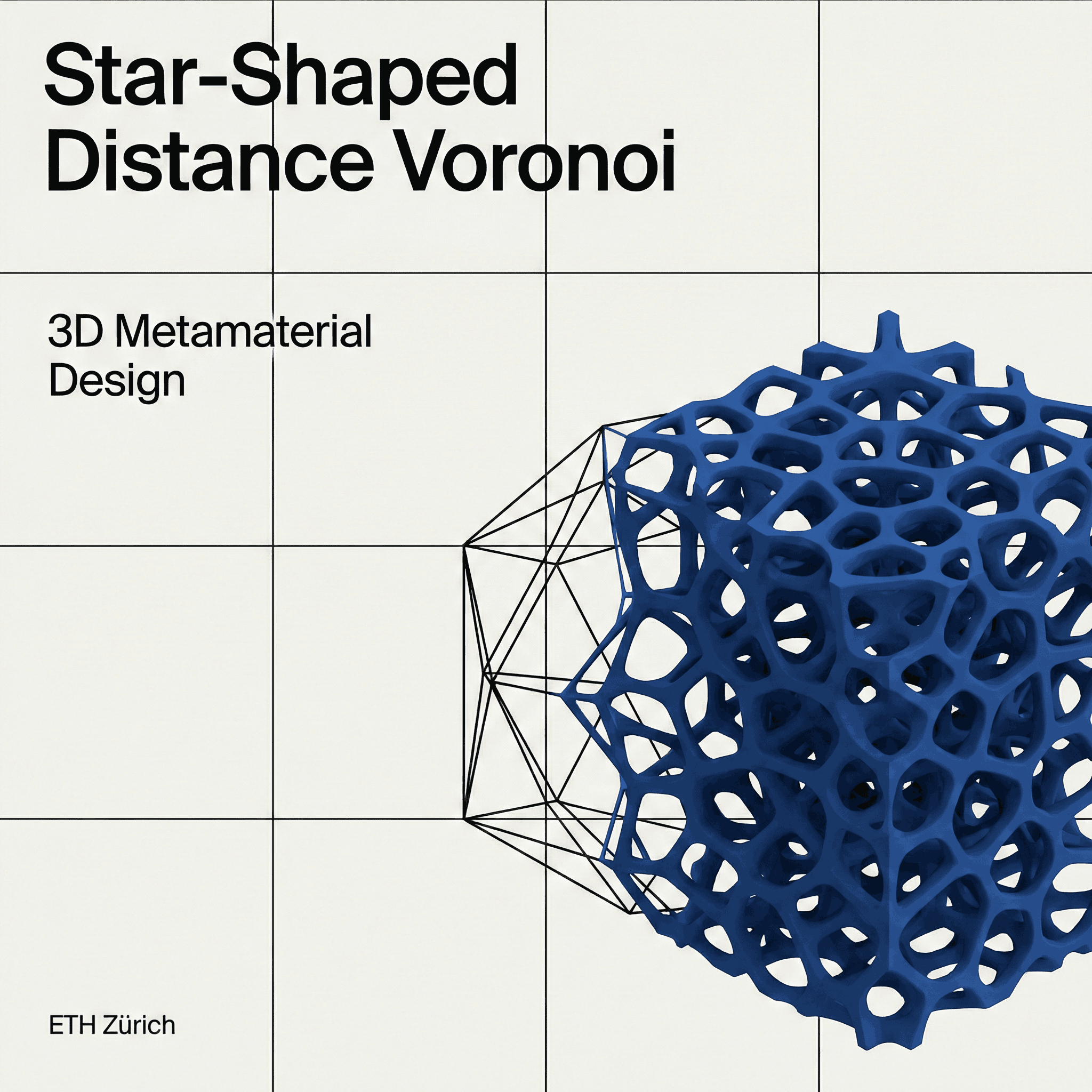 A recent paper from Logan Numerow, Stelian Coros, and Bernhard Thomaszewski at ETH Zürich proposes something closer to a grammar. Their work, "Star-Shaped Distance Voronoi Diagrams for 3D Metamaterial Design," extends a compelling 2D idea into the third dimension and, in doing so, constructs a continuous, differentiable parameterization over an extraordinarily broad space of cellular microstructures.